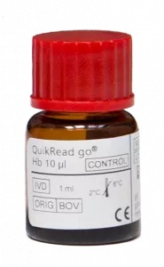 QuikRead go Hb 10 µl Control (kontrollanyag); körülbelül 125 g/l koncentráció a Hb-értéket is merő QuikRead go wrCRP+Hb tesztek Hb-érrtékének minőség-ellenőrzésére szolgáló termék, QuikRead go analizátorhoz.